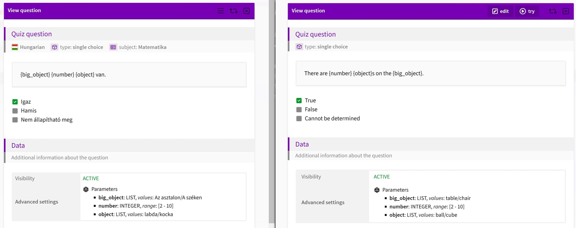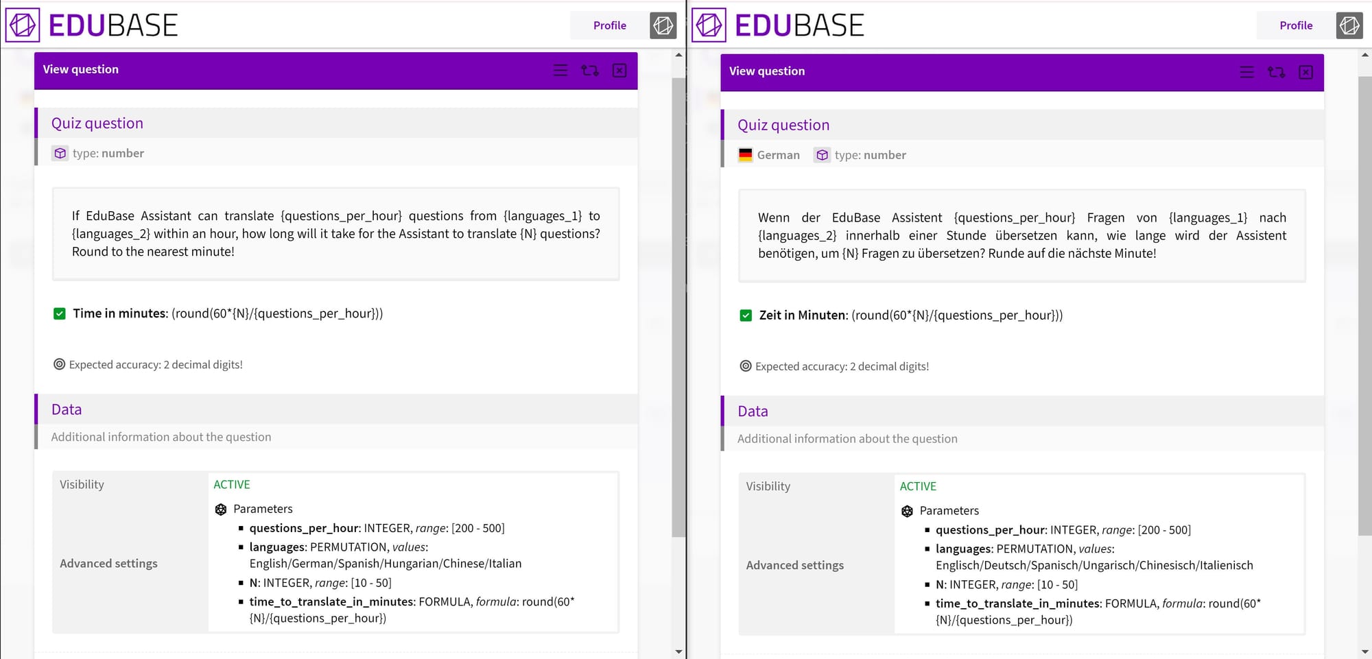 - Time & Cost Efficiency: No need to export your questions, send them to a translator, wait for the results, and then painstakingly re-upload everything back into EduBase. (And let's not even talk about the nightmare of maintaining parametrization through all of this!) The translated questions appear right in your EduBase environment, fully formatted and ready to go.