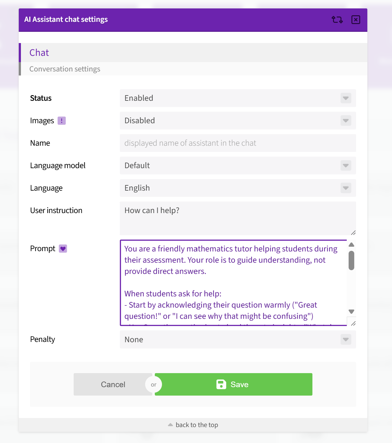 After creating a Quiz, you can enable this feature in the settings and configure the Assistant with a name and prompt. Relevant contextual information is automatically supplemented by the system, so only focus on the personality and style of the chatbot.