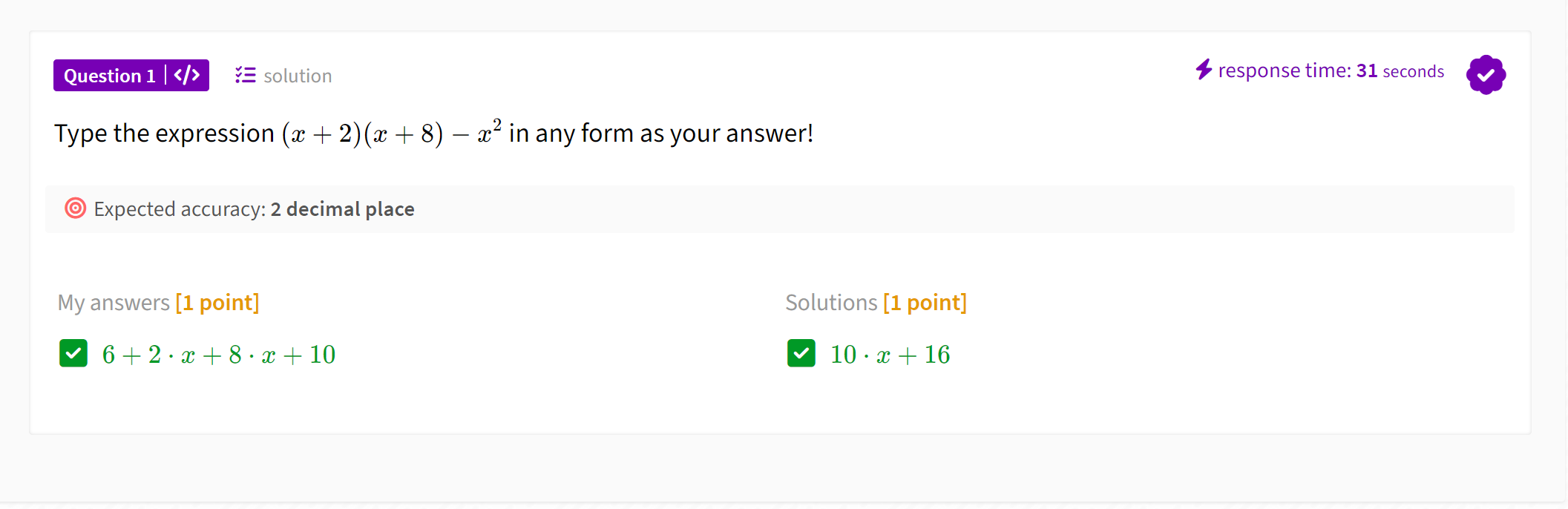 This question type is specifically designed to assess the students' answers regardless of the format of their input. Unlike traditional math quizzes that often require manual grading, EduBase can evaluate the equivalence of the solution and the students' input automatically. This not only saves time but also ensures accurate assessment of mathematical skills.